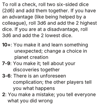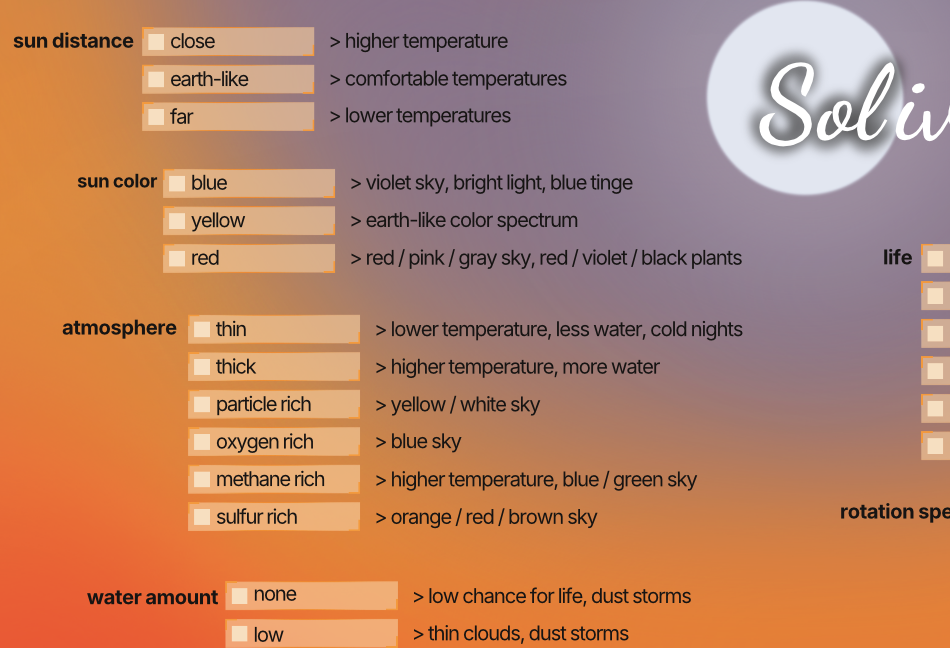 I like how thorough the planet creation is--really scratches my astronomy itch. I almost feel like the research in the gameplay loop could decide the planet's characteristics, in a "we don't know where we landed" way, but that would be a different game. The news portion helps seed the pearl of roleplaying, which is something I feel too many GM-less games lack. Was it meant to look like a postcard? "Greetings from Solivago--wish you were here!"